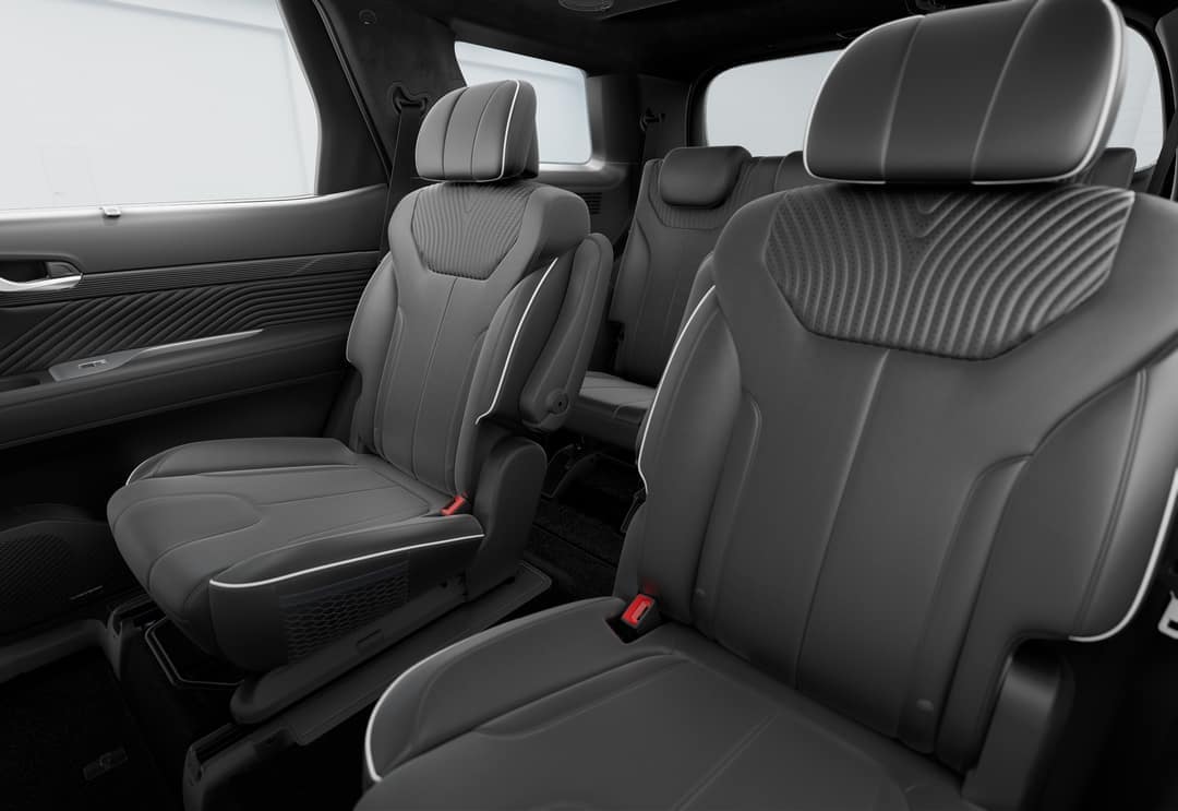 On the inside of the 2024 Hyundai Palisade, you have seating for seven or eight people, depending on your configuration. The base model has standard seating for eight people with second and third row bench seating. There is a seven-person configuration option with second-row captain's chairs that replace the second-row bench seat.