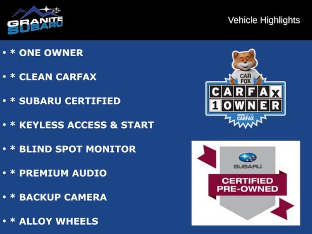 * ONE OWNER, * CLEAN CARFAX, * SUBARU CERTIFIED, * KEYLESS ACCESS & START, * BLIND SPOT MONITOR, * PREMIUM AUDIO, * BACKUP CAMERA, * ALLOY WHEELS. Odometer is 8577 miles below market average!