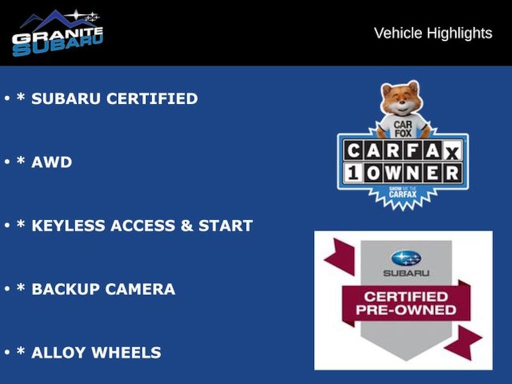 * SUBARU CERTIFIED, * AWD, * KEYLESS ACCESS & START, * BACKUP CAMERA, * ALLOY WHEELS. Odometer is 9293 miles below market average!