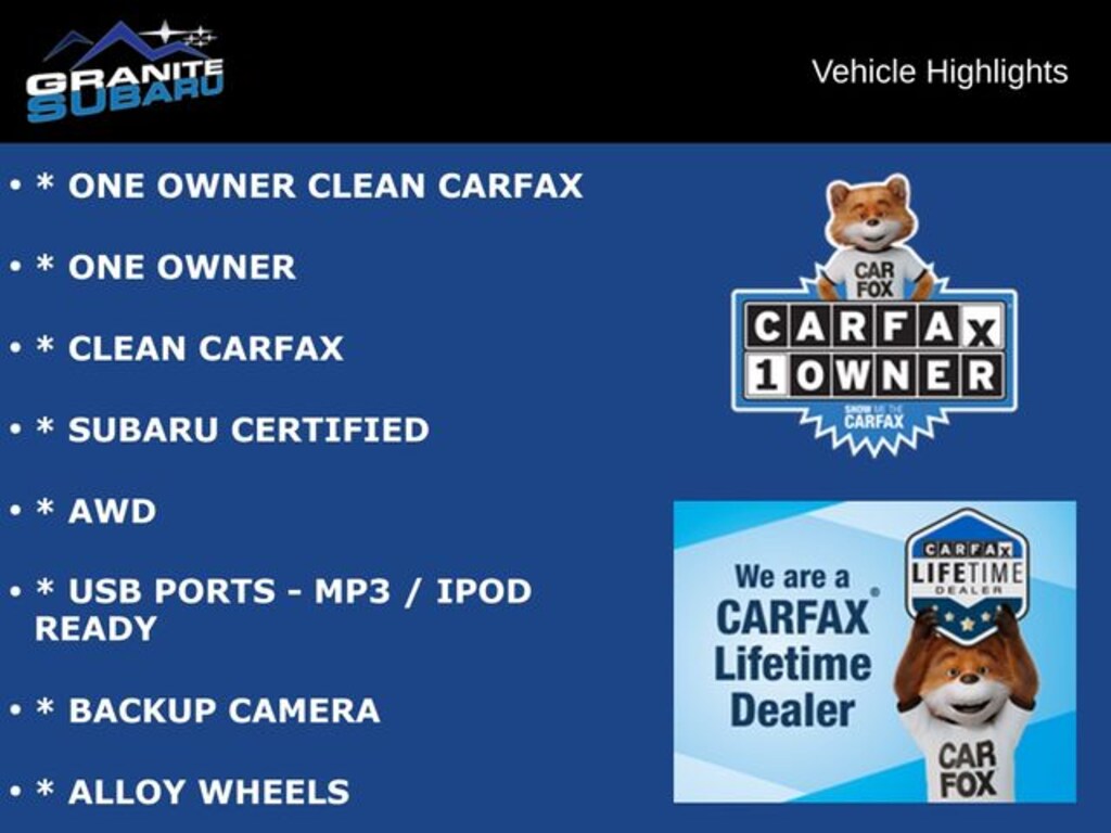 * ONE OWNER CLEAN CARFAX, * ONE OWNER, * CLEAN CARFAX, * SUBARU CERTIFIED, * AWD, * USB PORTS - MP3 / IPOD READY, * BACKUP CAMERA, * ALLOY WHEELS. Odometer is 13114 miles below market average!