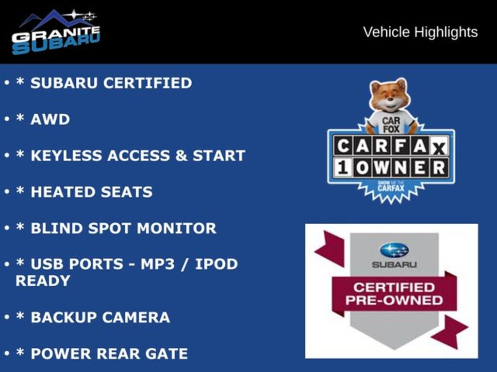 * SUBARU CERTIFIED, * AWD, * KEYLESS ACCESS & START, * HEATED SEATS, * BLIND SPOT MONITOR, * USB PORTS - MP3 / IPOD READY, * BACKUP CAMERA, * POWER REAR GATE.