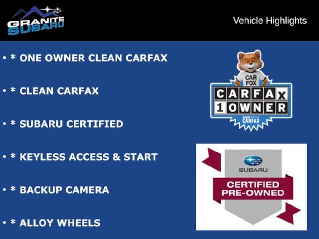 * ONE OWNER CLEAN CARFAX, * CLEAN CARFAX, * SUBARU CERTIFIED, * KEYLESS ACCESS & START, * BACKUP CAMERA, * ALLOY WHEELS.