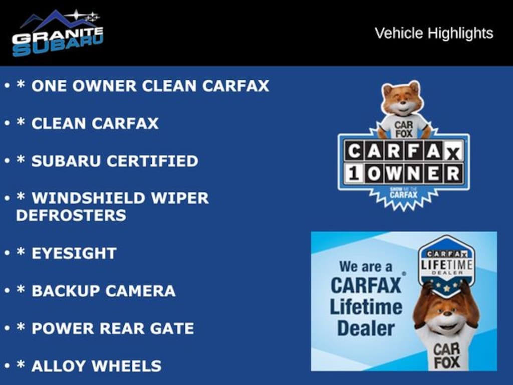 * ONE OWNER CLEAN CARFAX, * CLEAN CARFAX, * SUBARU CERTIFIED, * WINDSHIELD WIPER DEFROSTERS, * EYESIGHT, * BACKUP CAMERA, * POWER REAR GATE, * ALLOY WHEELS.