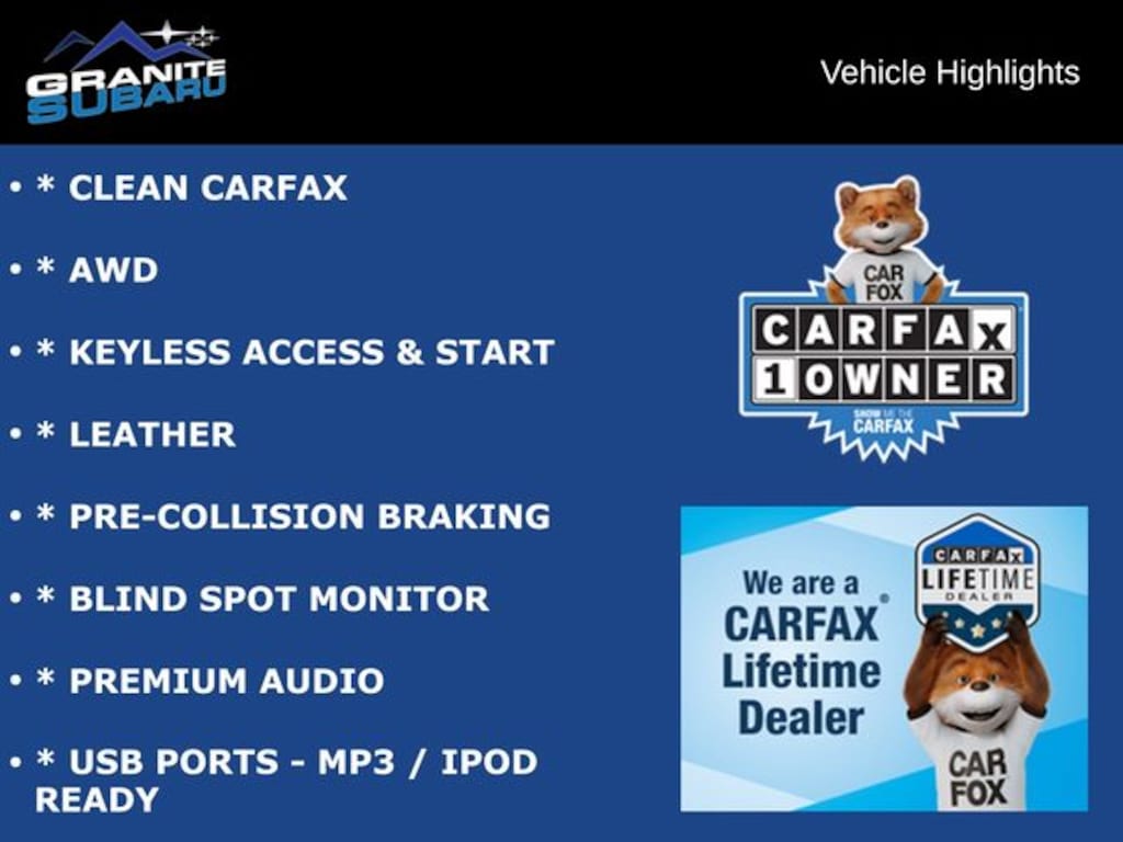 * CLEAN CARFAX, * AWD, * KEYLESS ACCESS & START, * LEATHER, * PRE-COLLISION BRAKING, * BLIND SPOT MONITOR, * PREMIUM AUDIO, * USB PORTS - MP3 / IPOD READY, * BACKUP CAMERA, * ALLOY WHEELS, Black Leather.